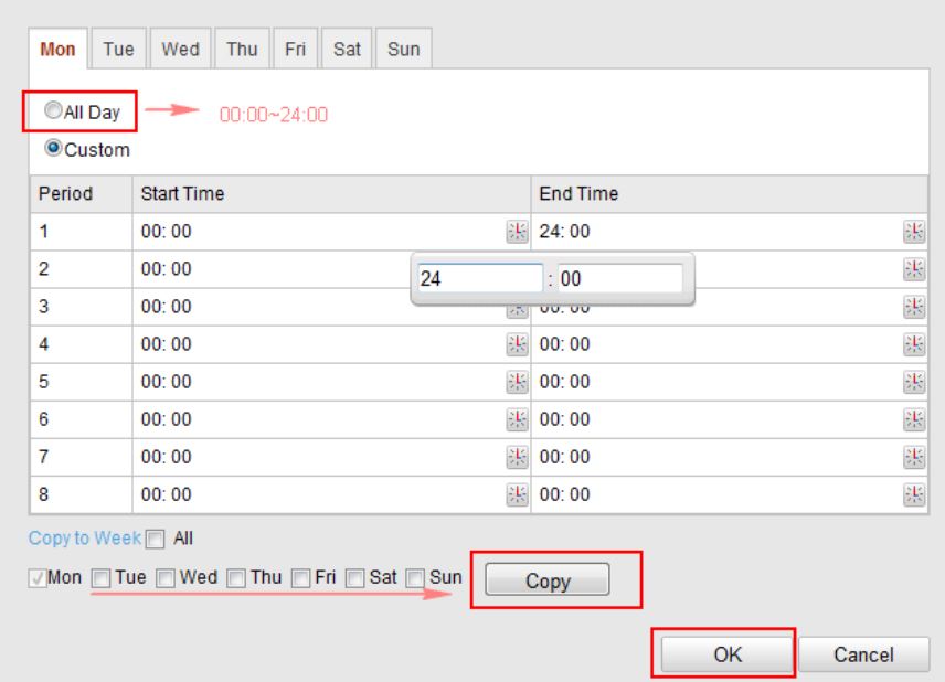 After setting the arming schedule, click the Copy button to copy the schedule to other days. Click the OK button to save the settings. The time of each period cannot be overlapped.
