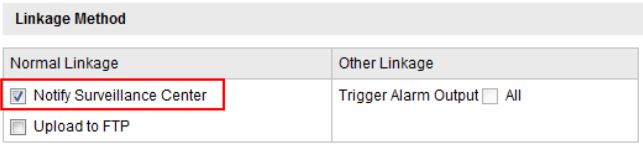 Step 9. Check the checkbox to select the linkage method. Click on Notify Surveillance Center (will send an exception or alarm signal to remote management software when an event occurs). Save the settings.