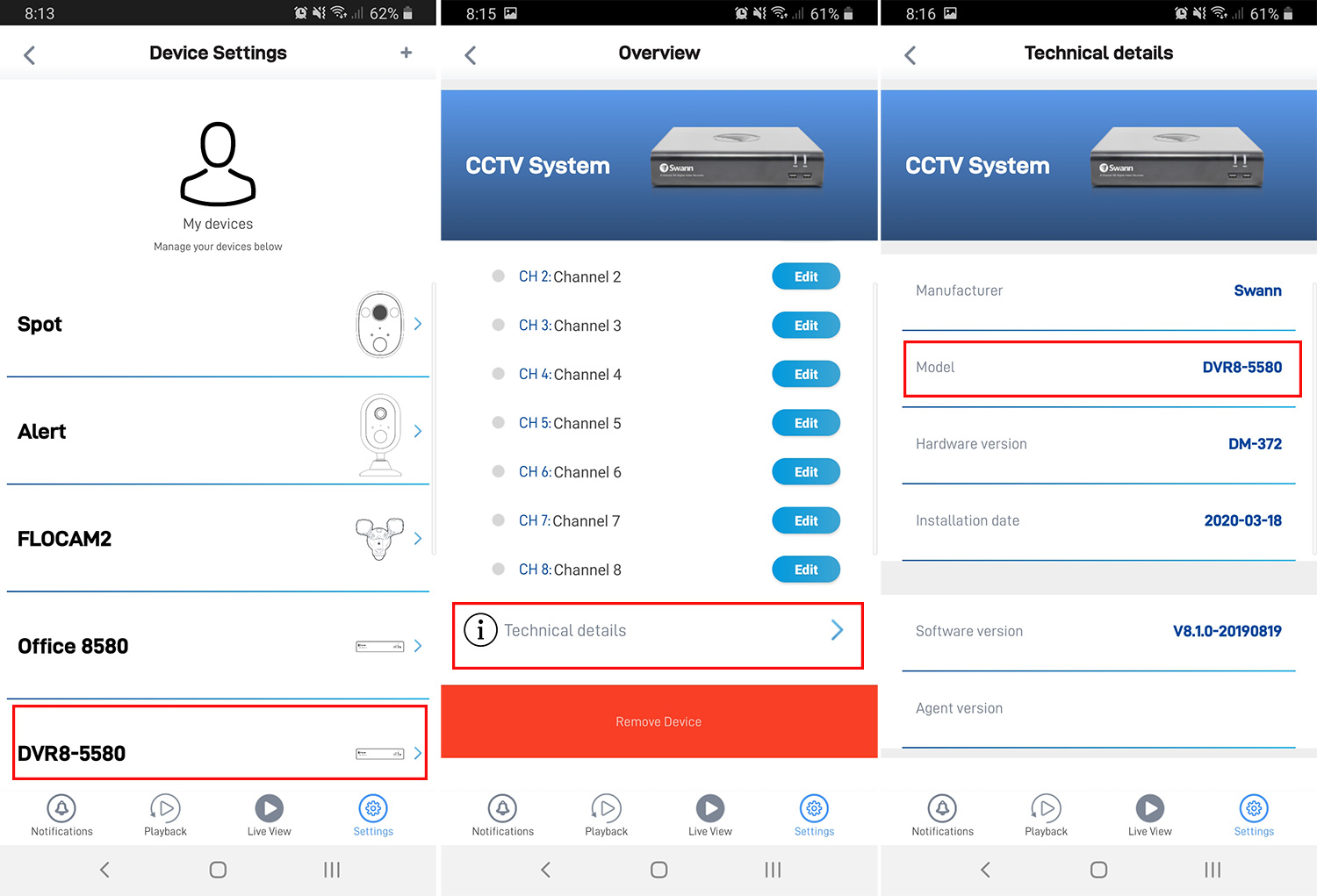 You must go to Settings (at the lower right) then select your device (if you only have one Swann unit only, it will automatically select that device). Swipe all the way to the bottom then tap on Technical Details then check the Model.