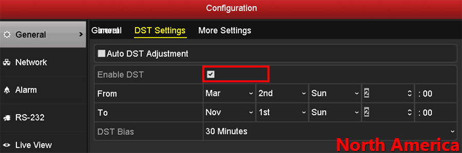 Navigate to the General Settings interface. (Menu > Configuration> General). Choose the DST Settings tab. Here you can set when daylight saving time starts and ends. Fill out the settings exactly as shown in the picture below. Don’t forget to manually check the Enable DST checkbox.