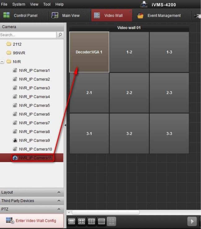 Step 3. Go to Video Wall, and then drag the camera to VGA1 of the decoder. Now the sub-stream will be decoded to monitor VGA1.