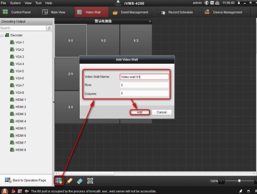 Step 8. Click to add a video wall, and then type in Name, Row and Column.