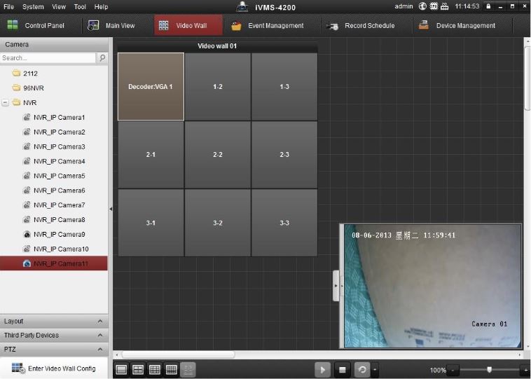 The video wall feature in the Hikvision iVMS-4200 camera management software consists of one to many monitors being driven by a Hikvision decoder or video wall controller.