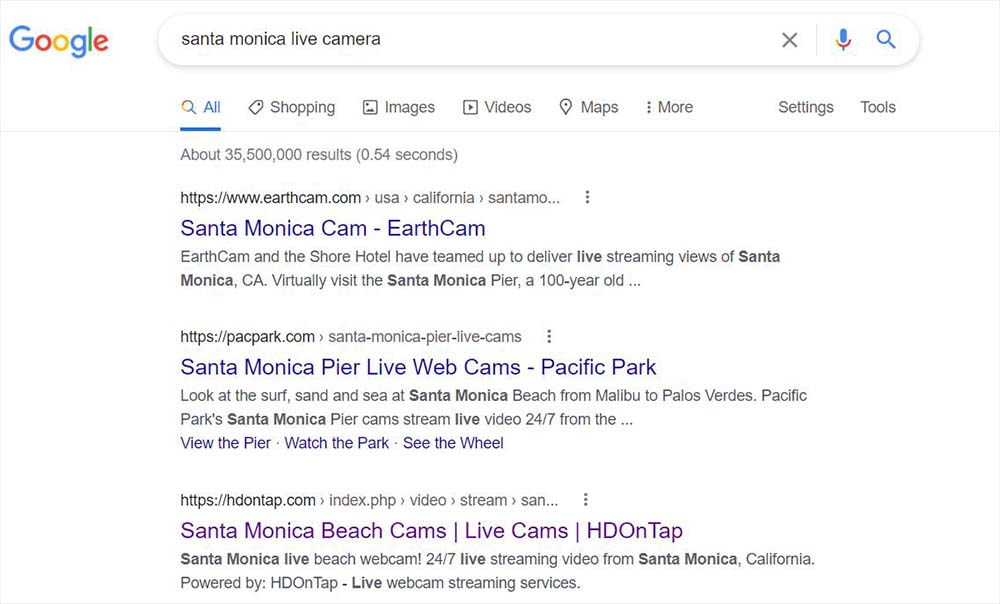 For example, search “Santa Monica live beach camera” and google will list a lot of websites offering live cameras from Santa Monica.