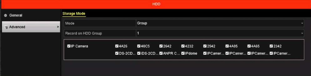 Step 1. Setting the NVR using the local monitor, the path should be from the NVR Menu, select “HDD” then select “Advanced”. First you should choose the “Group Mode“, then you can set which channel can record to which group.