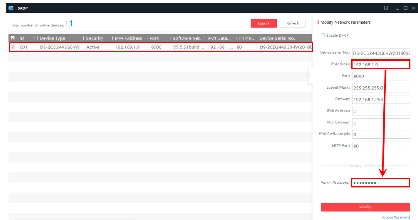 Step 1. Run the SADP software and the tool will list all the IP cameras located in the same network. Make sure you see your camera over there. In this example the IP address of our camera is 192.168.1.9. If necessary you can activate or modify the IP address of the camera (as shown in the picture below).