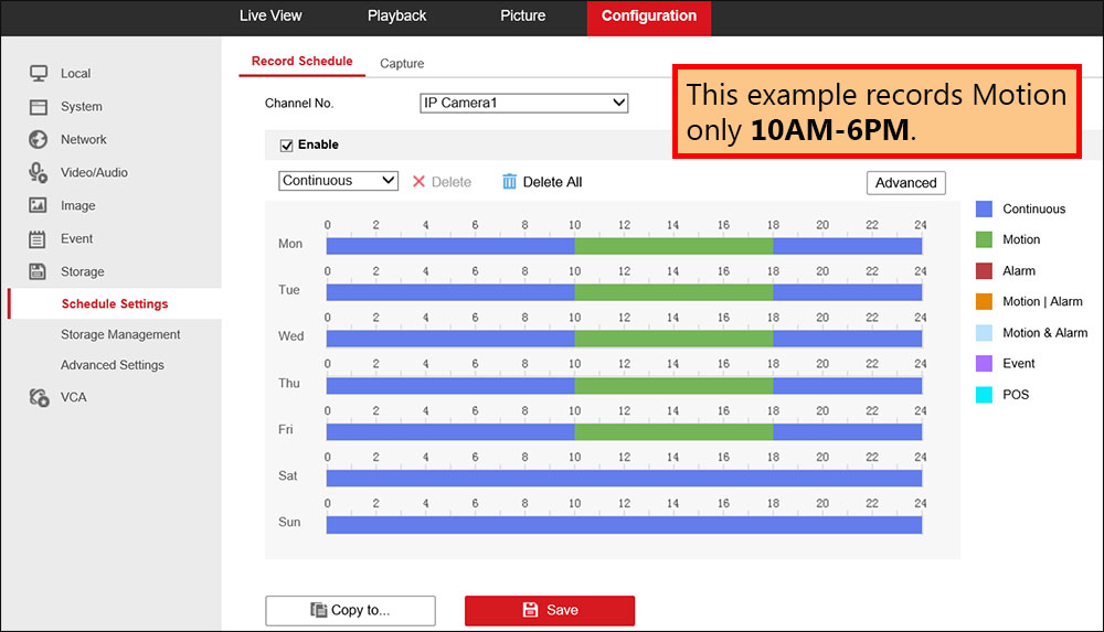 By default, your Hikvision NVR will come out of the box set to record continuously seven days a week, 24 hours a day, so all the time. You also have the ability to customize your recording schedule. You can set it to record motion only, or not record on certain days, or hours of the day.