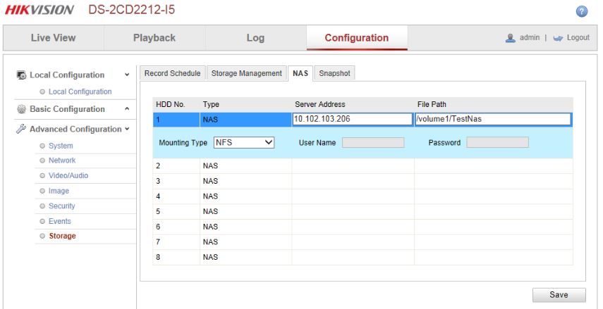 Step 6. Add NAS to an IP camera. Go to the web client of the Hikvision camera and select NFS as the mounting type and input the server address and file path, then click save.